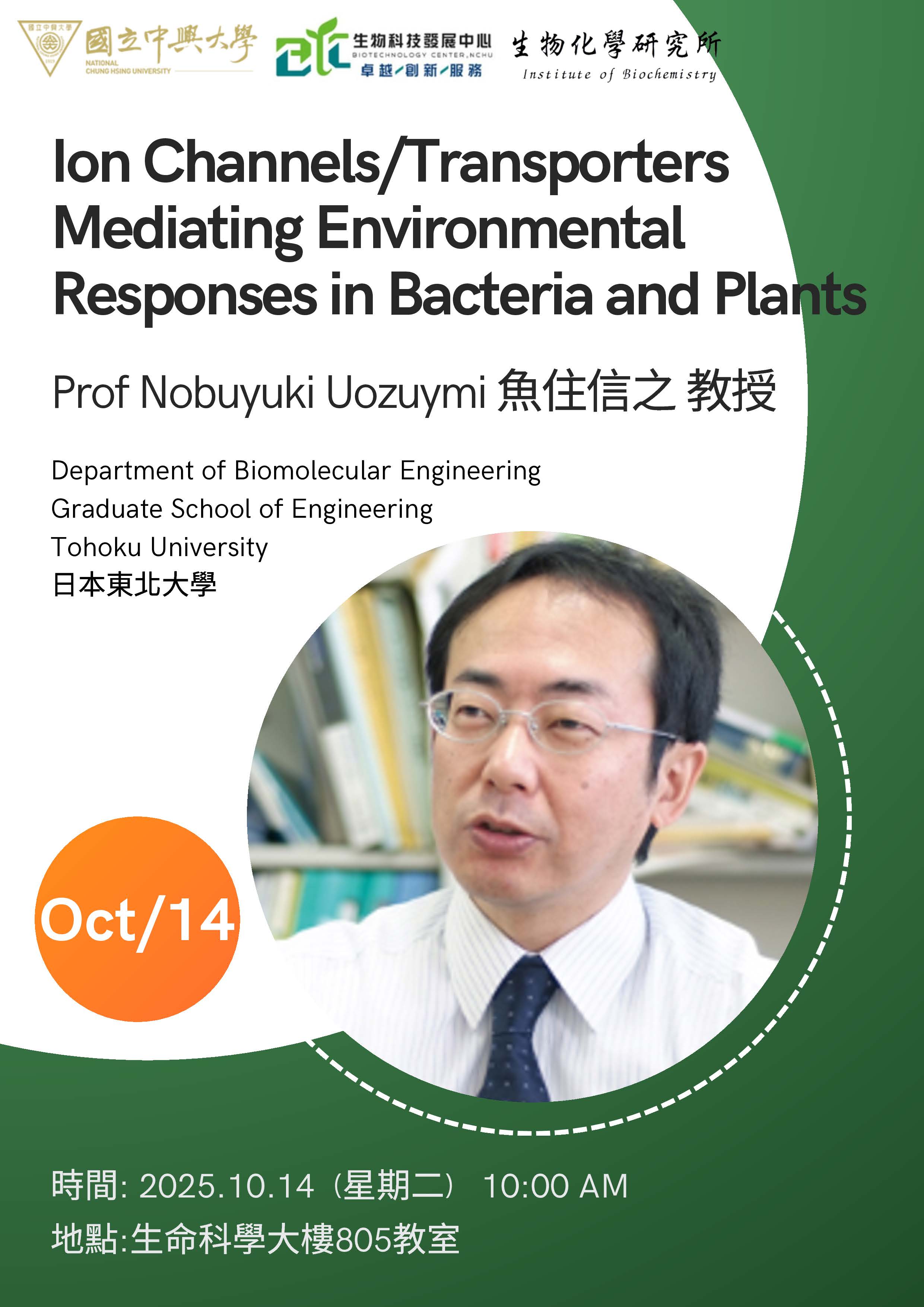 【專題演講】114年10月14日(星期二) 10:00 生化所805教室-Prof Nobuyuki Uozymi (Department of Biomolecular Engineering, Graduate School of Engineering, Tohoku University)