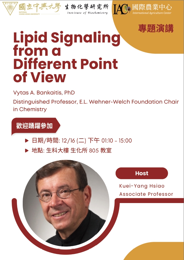 【專題演講】114年12月16日(星期二) 13:10 生化所805教室-Vytas A. Bankaitis, PhD (Distinguished Professor, E.L. Wehner-Welch Foundation Chair in Chemistry)
